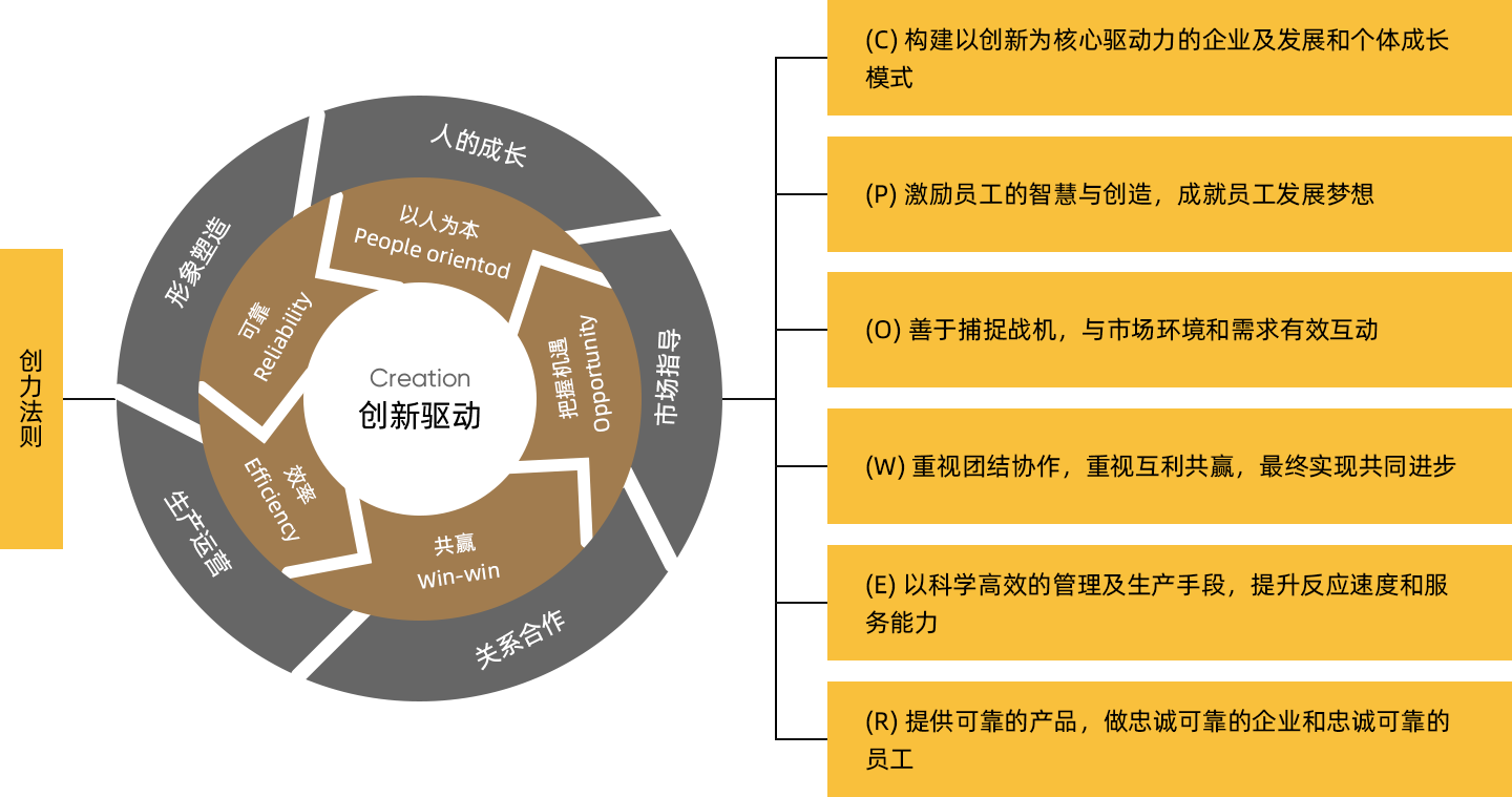 以人為本,把人看做創力的第一資源,激勵員工的智慧與創造,成就員工發展夢想;把握機遇,創力人對市場極度敏感,善于捕捉戰機,實現與市場環境和客戶需求的有效互動;共贏,推進團結協作,重視互利共贏,最終實現共同進步;效率,追求效率,重視效果,以科學高效的管理及生產手段,提升響應速度和服務能力;可靠,提供可靠的產品,做忠誠可靠的企業和忠誠可靠的員工。