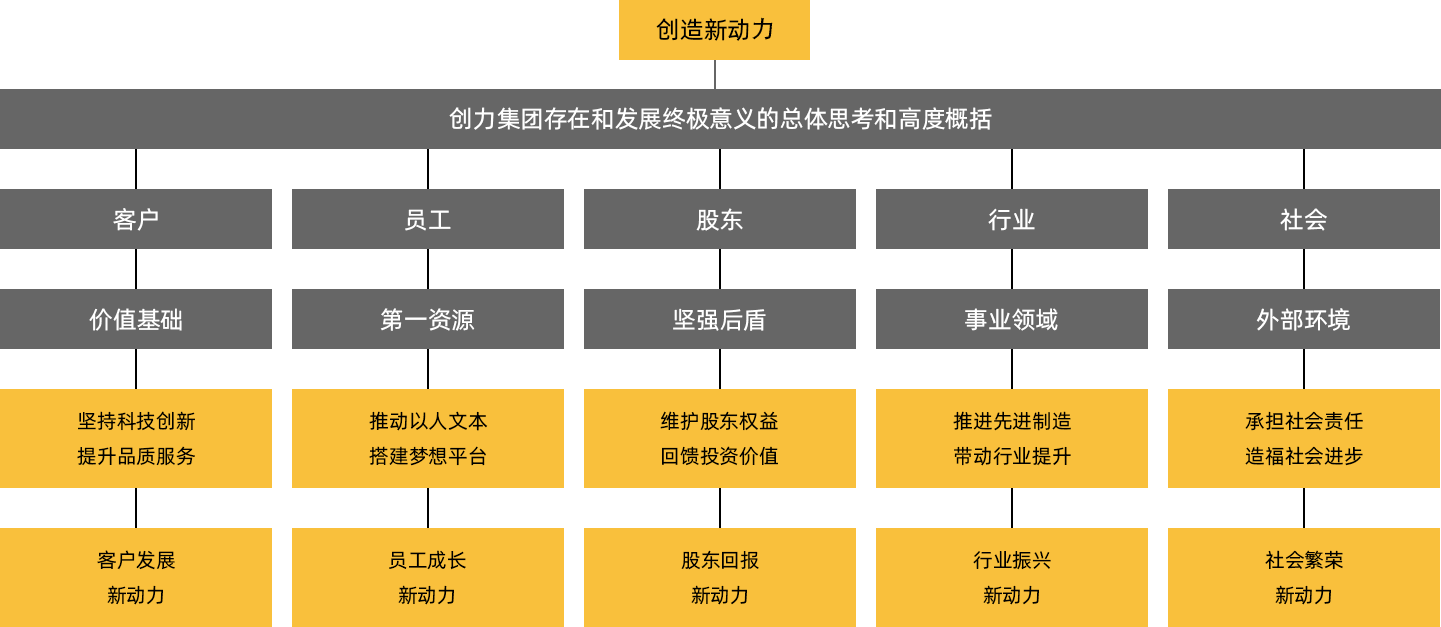 我們堅持科技創新,提升品質服務,為客戶發展創造新動力;我們推動以人為本,搭建夢想平臺,為員工成長創造新動力;我們維護股東權益,回饋投資價值,為股東回報創造新動力;我們推動先進制造、帶動行業提升,為行業振興創造新動力;我們承擔社會責任,造福社會進步,為社會繁榮創造新動力。